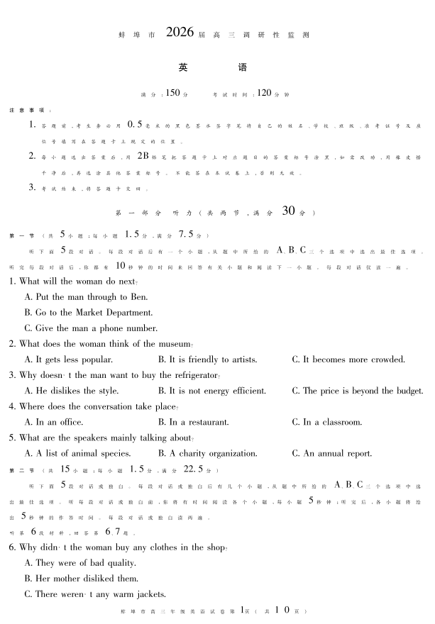 高三英语--安徽省蚌埠市2026届高三上学期8月调研性监测