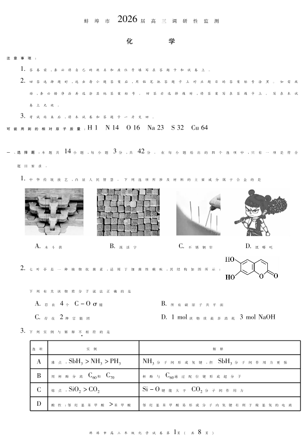 高三化学--安徽省蚌埠市2026届高三上学期8月调研性监测