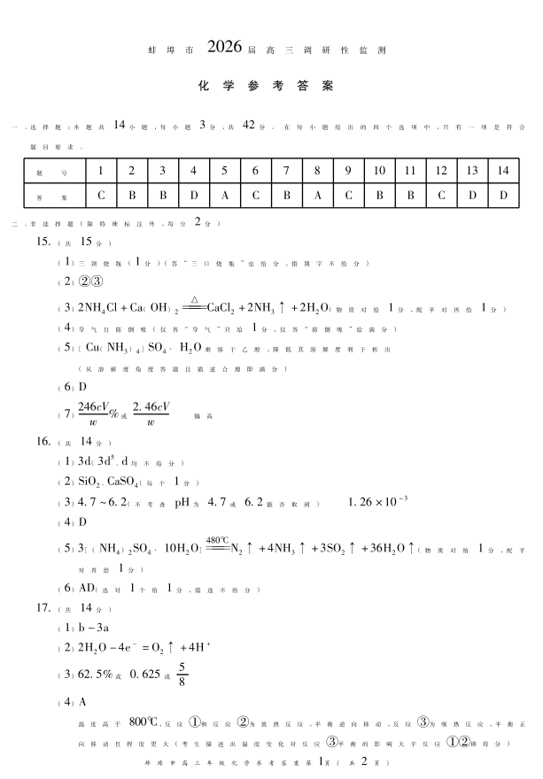高三化学答案--安徽省蚌埠市2026届高三上学期8月调研性监测