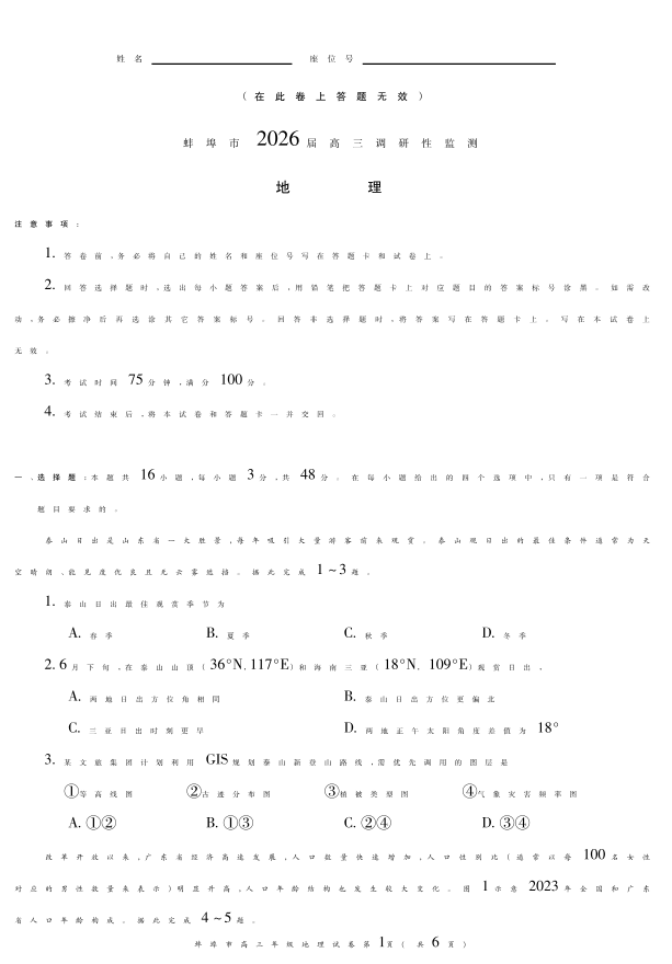 高三地理--安徽省蚌埠市2026届高三上学期8月调研性监测