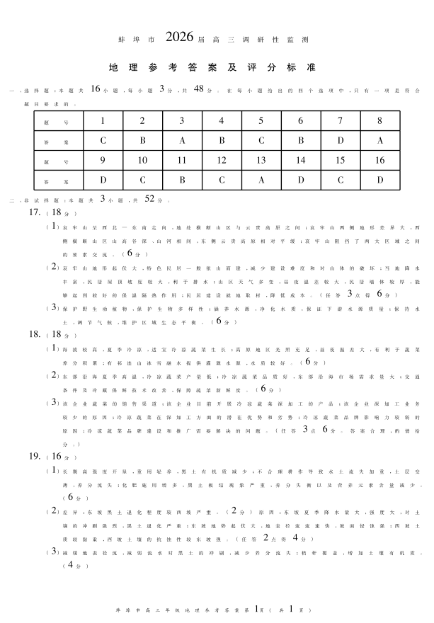 高三地理答案--安徽省蚌埠市2026届高三上学期8月调研性监测