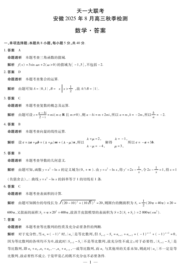 高三数学答案--安徽省天一大联考2026届高三上学期8月秋季检测