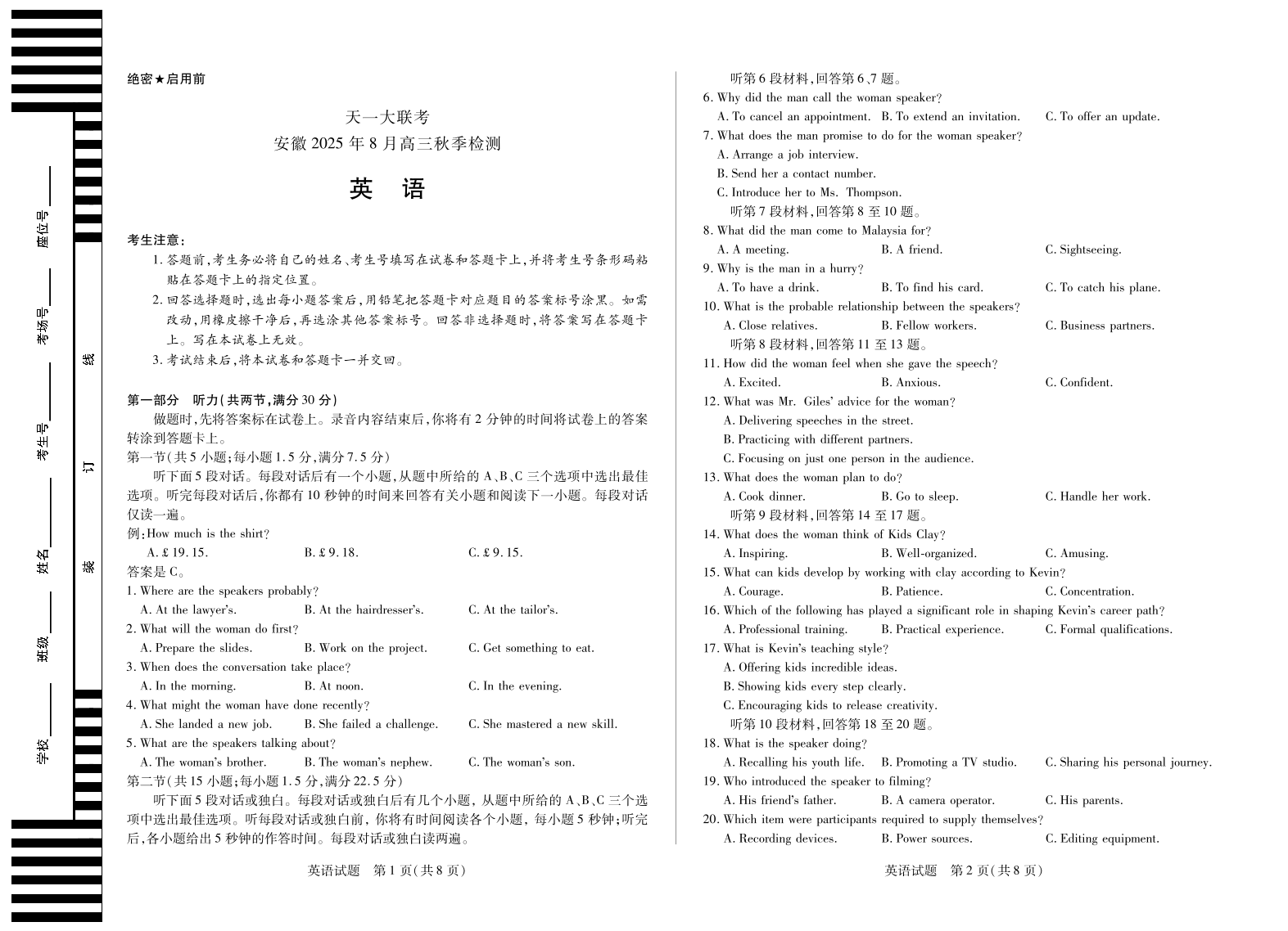 高三英语--安徽省天一大联考2026届高三上学期8月秋季检测