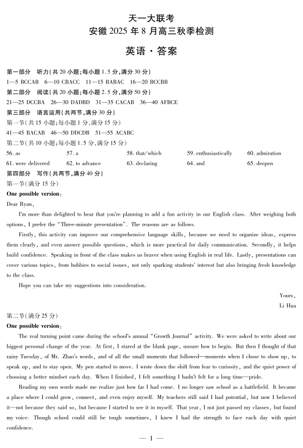 高三英语答案--安徽省天一大联考2026届高三上学期8月秋季检测