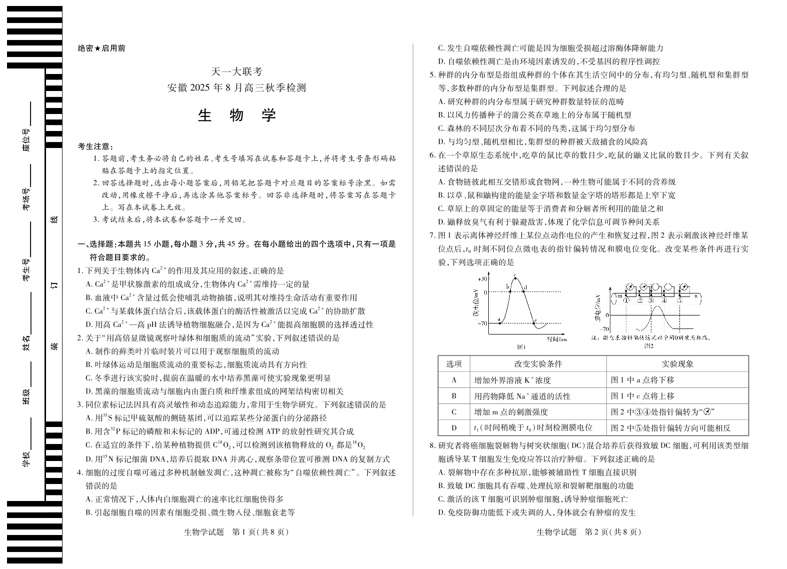 高三生物--安徽省天一大联考2026届高三上学期8月秋季检测