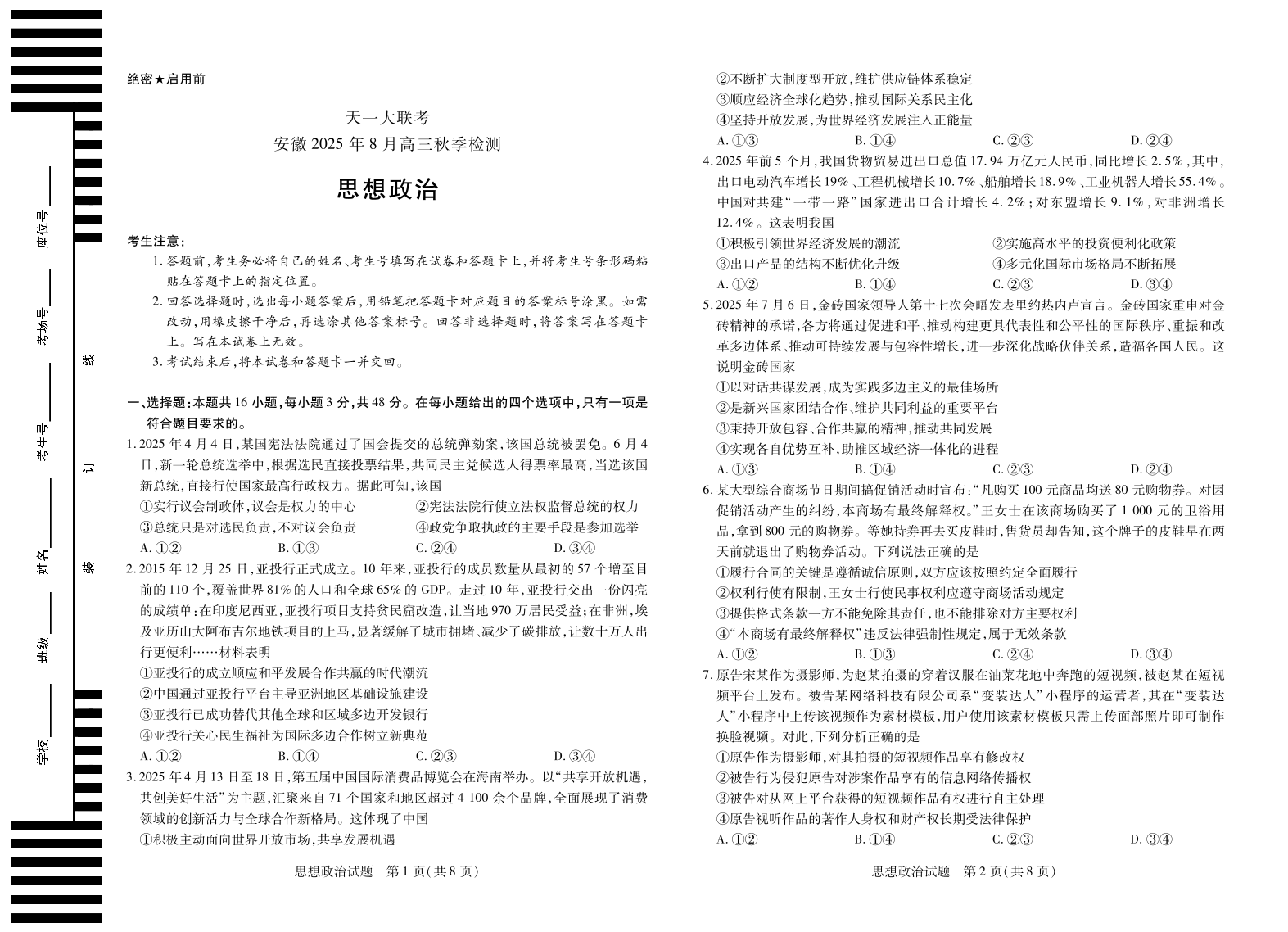 高三政治--安徽省天一大联考2026届高三上学期8月秋季检测