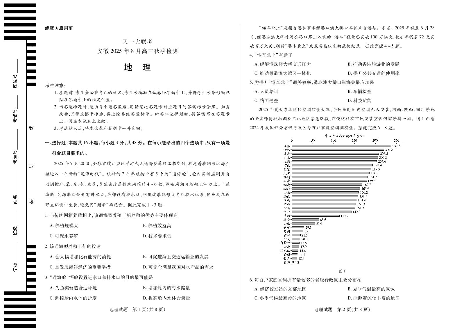 高三地理--安徽省天一大联考2026届高三上学期8月秋季检测