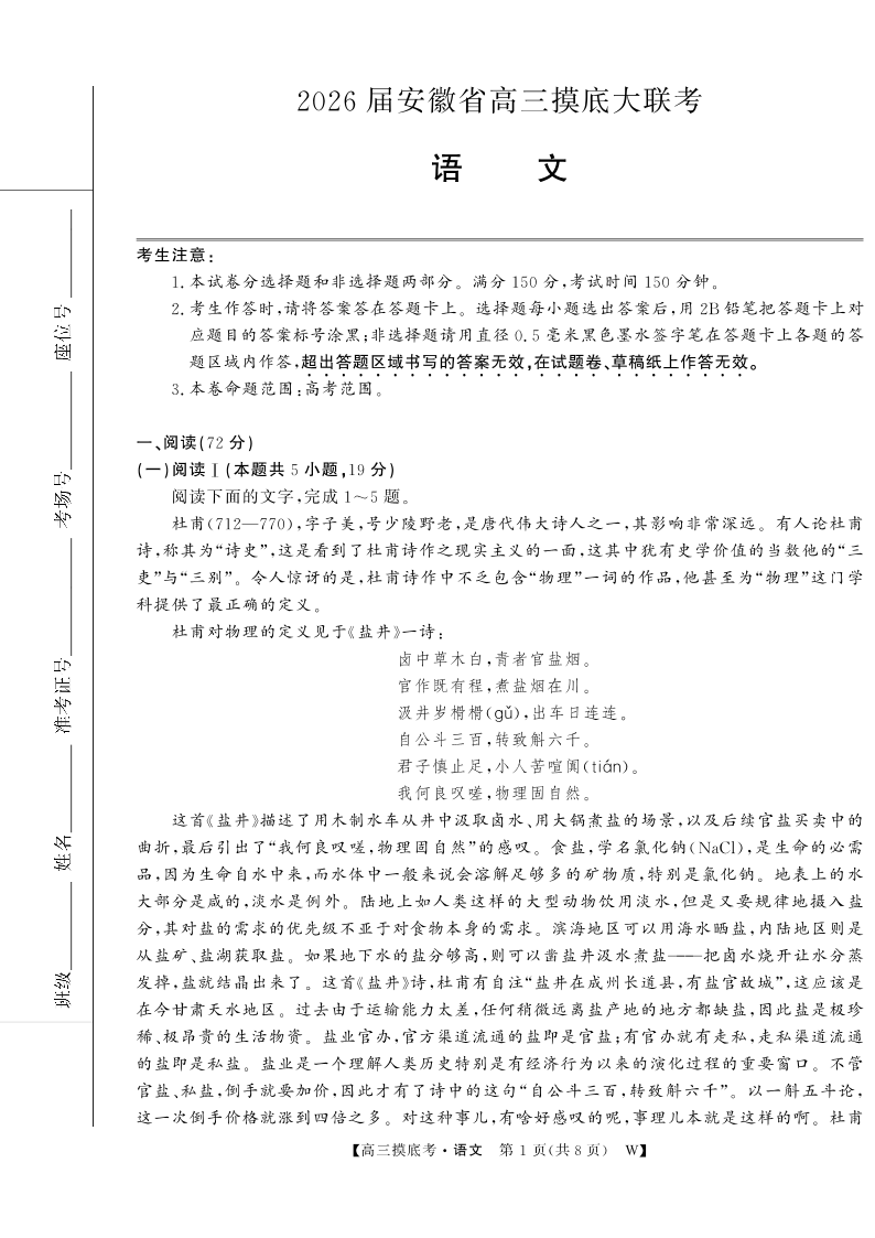 高三语文--安徽省皖南八校2026届高三上学期8月摸底大联考