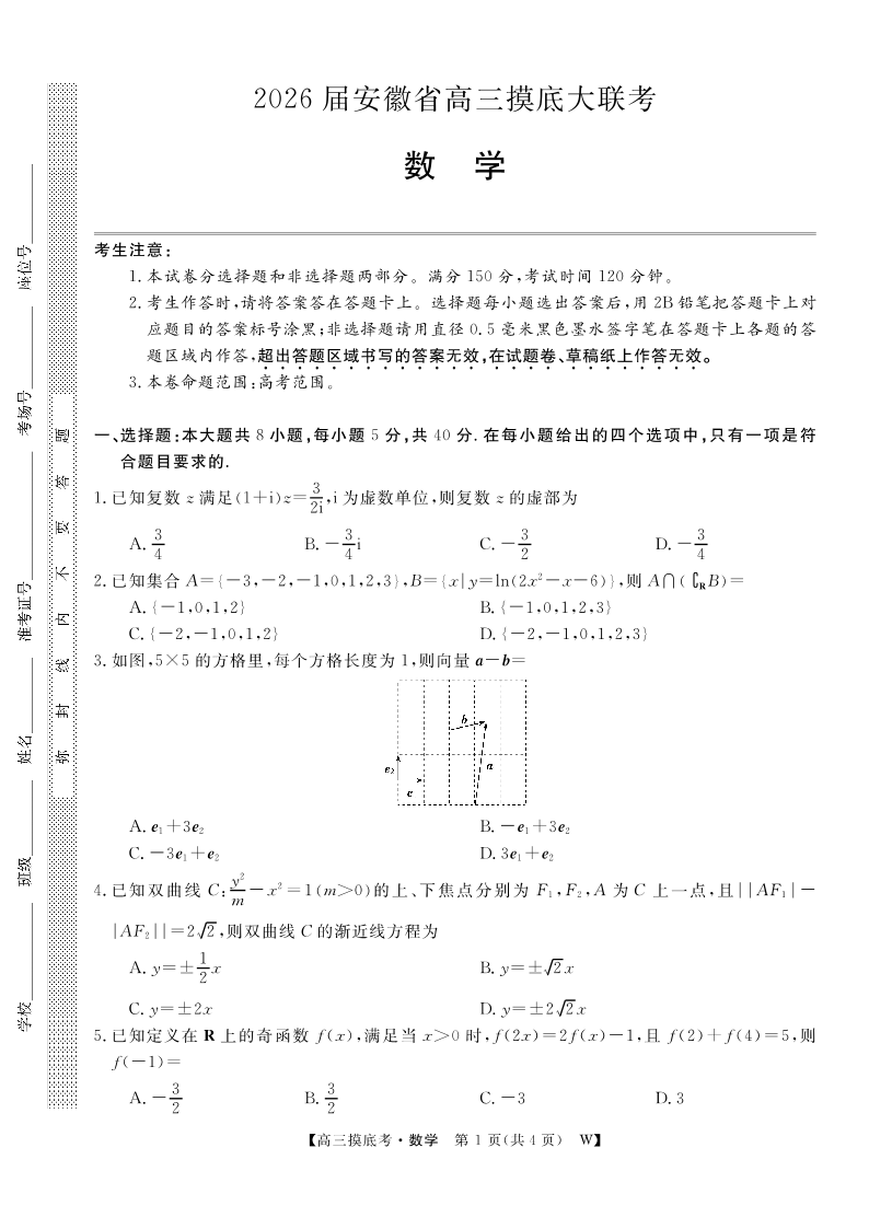 高三数学--安徽省皖南八校2026届高三上学期8月摸底大联考