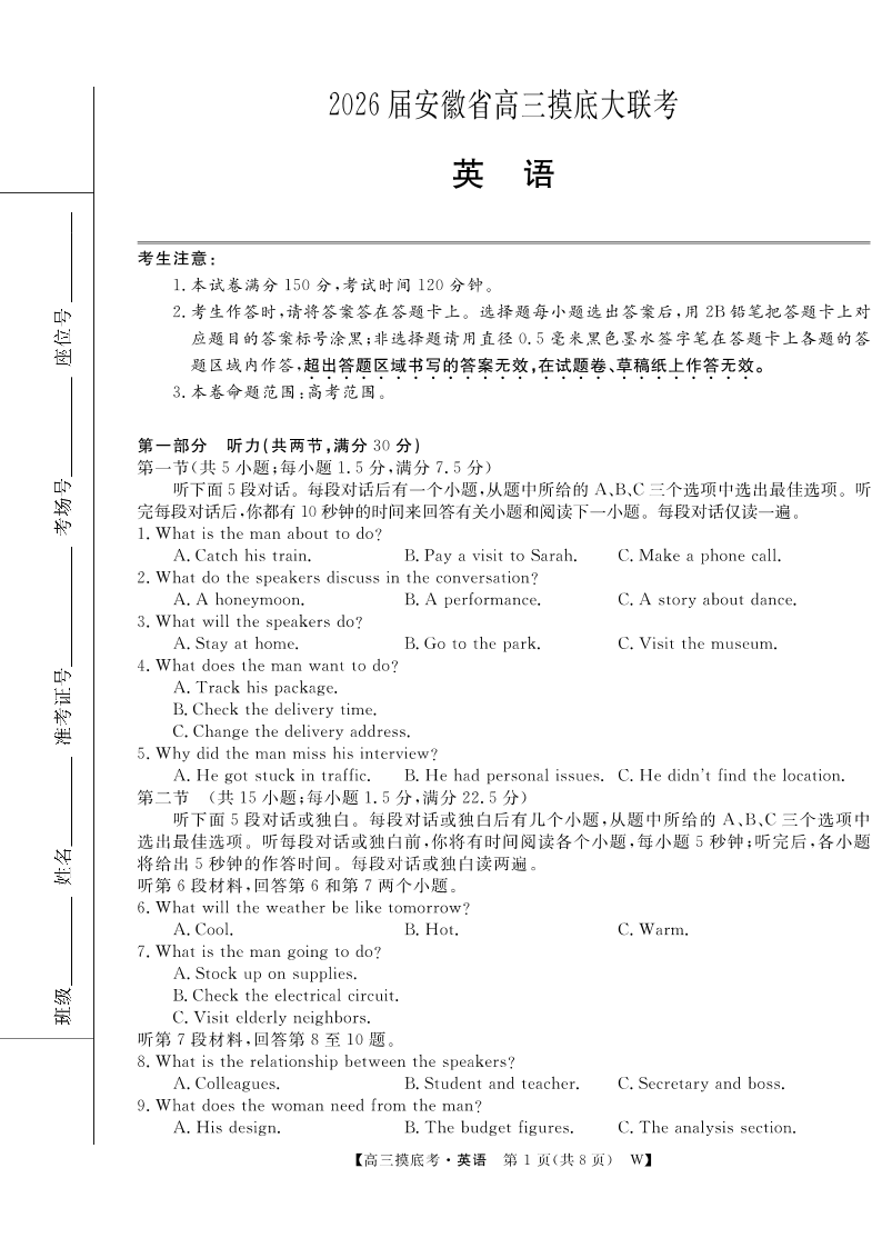 高三英语--安徽省皖南八校2026届高三上学期8月摸底大联考