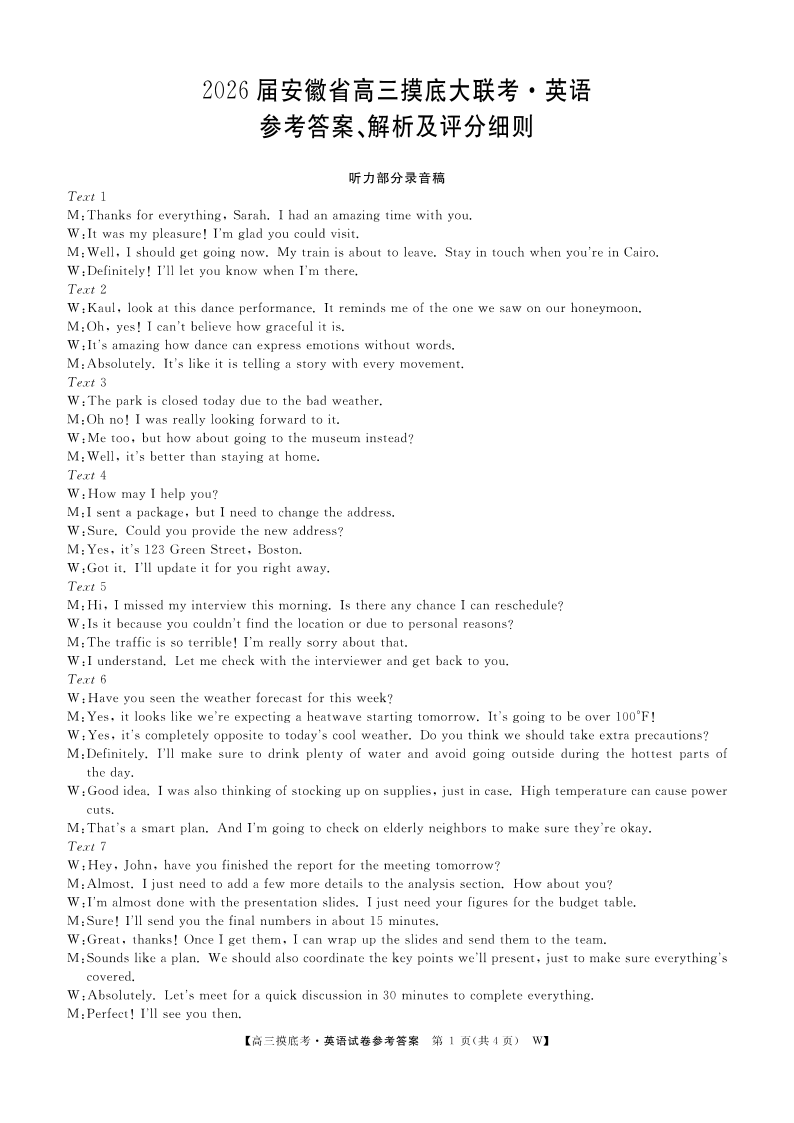 高三英语答案--安徽省皖南八校2026届高三上学期8月摸底大联考