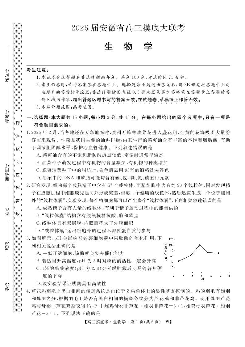 高三生物--安徽省皖南八校2026届高三上学期8月摸底大联考