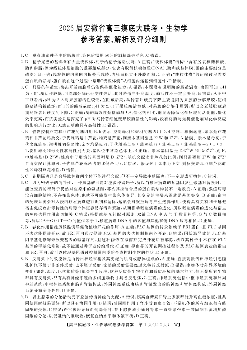 高三生物答案--安徽省皖南八校2026届高三上学期8月摸底大联考