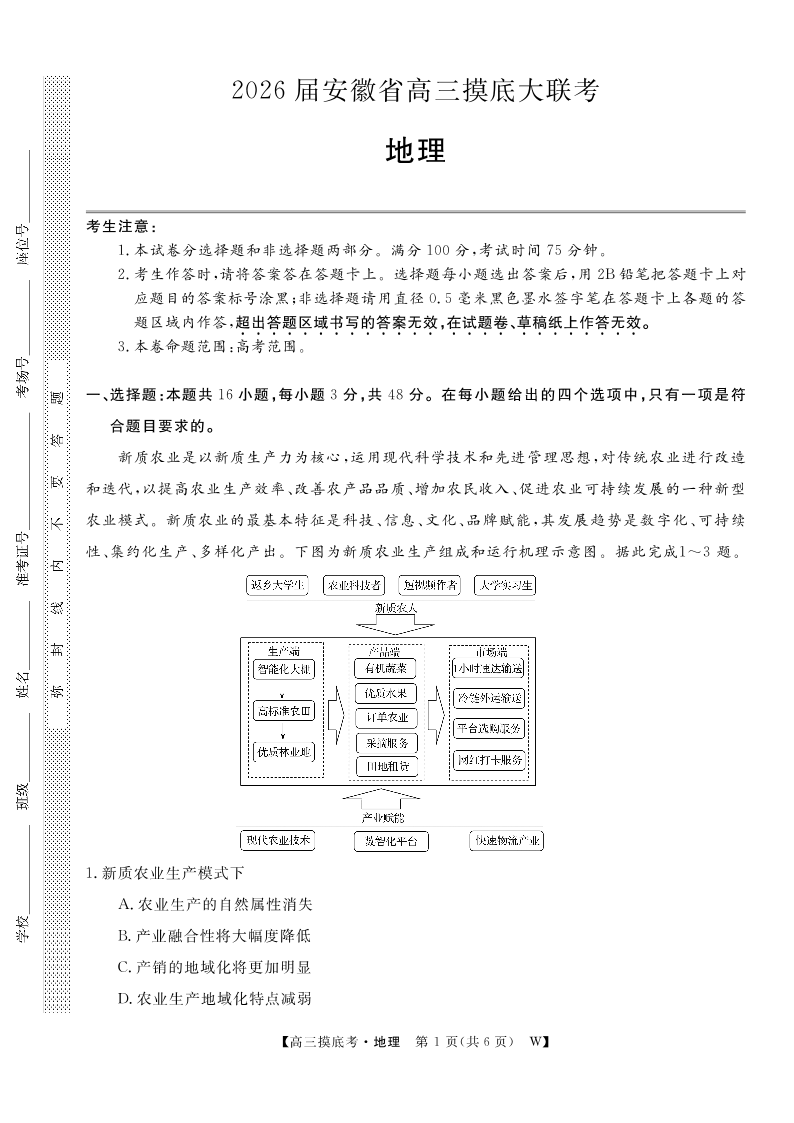 高三地理--安徽省皖南八校2026届高三上学期8月摸底大联考