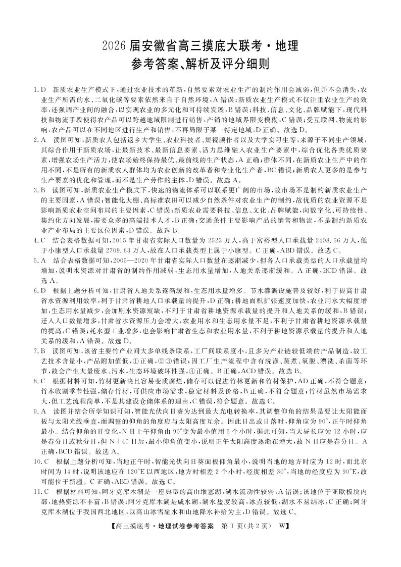 高三地理答案--安徽省皖南八校2026届高三上学期8月摸底大联考