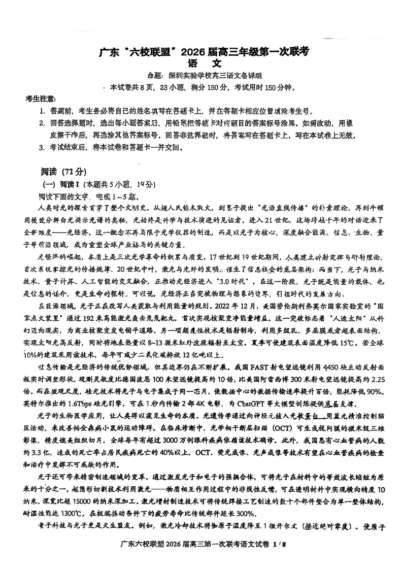 高三语文--广东六校联盟2026届高三第一次联考