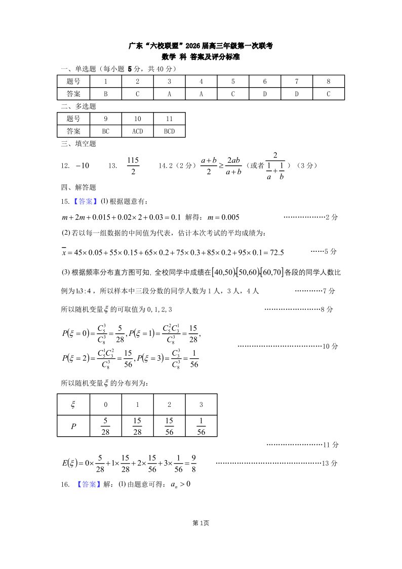 高三数学答案--广东六校联盟2026届高三第一次联考