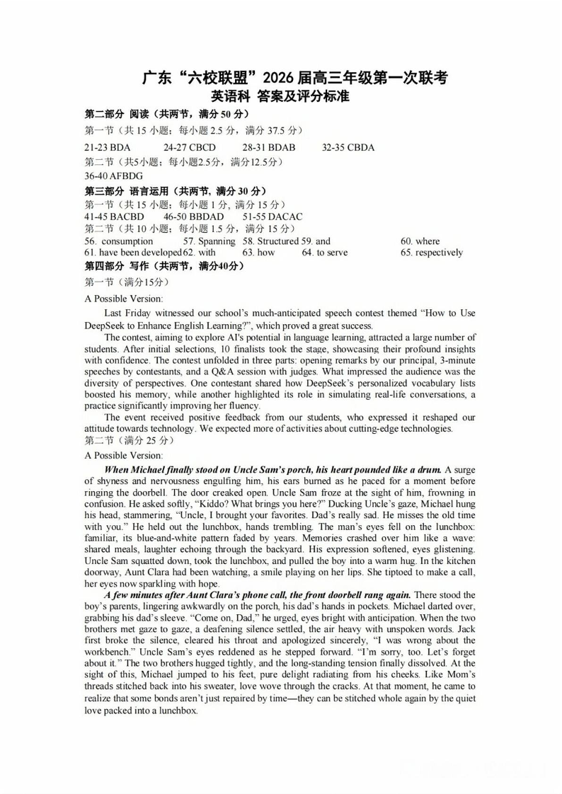 高三英语答案--广东六校联盟2026届高三第一次联考