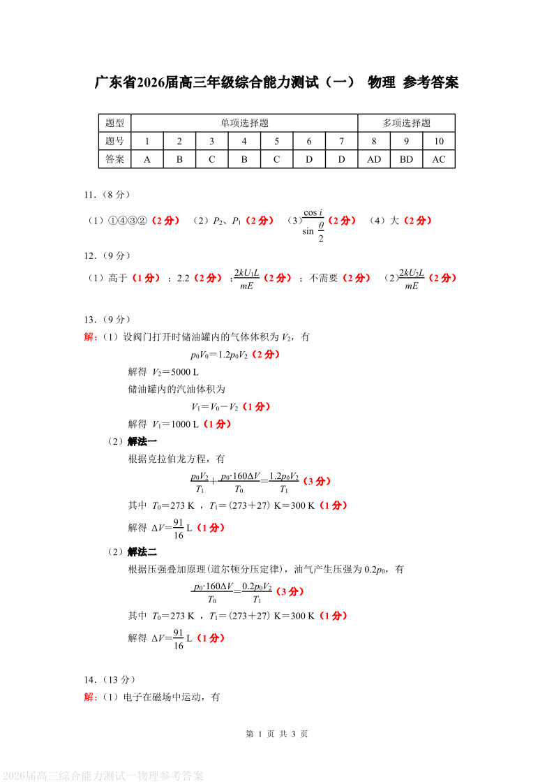 高三物理答案--广东省光大联考2026届高三上学期综合能力测试(一)