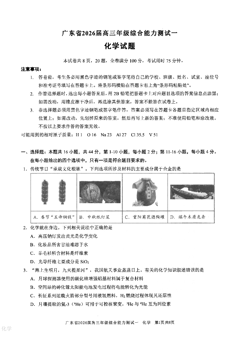 高三化学--广东省光大联考2026届高三上学期综合能力测试(一)