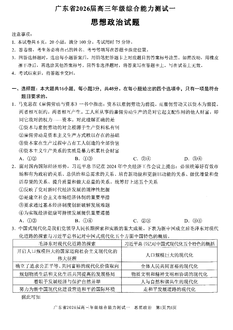高三政治--广东省光大联考2026届高三上学期综合能力测试(一)