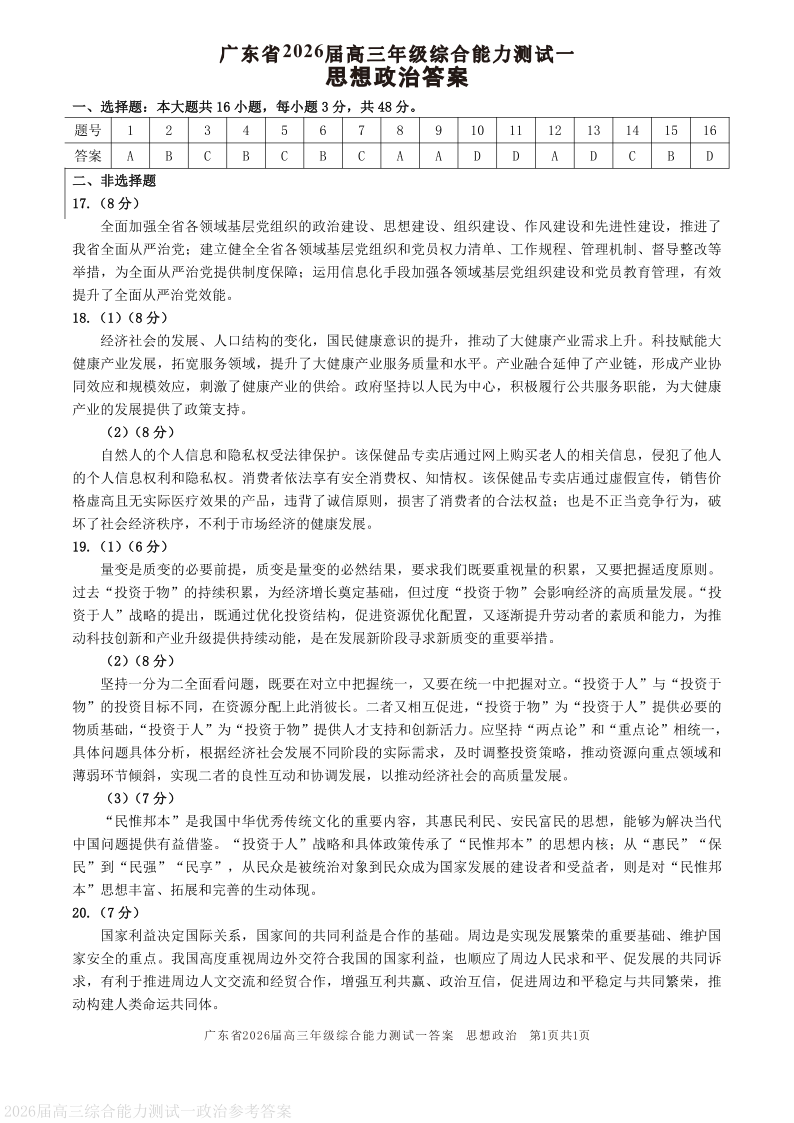 高三政治答案--广东省光大联考2026届高三上学期综合能力测试(一)