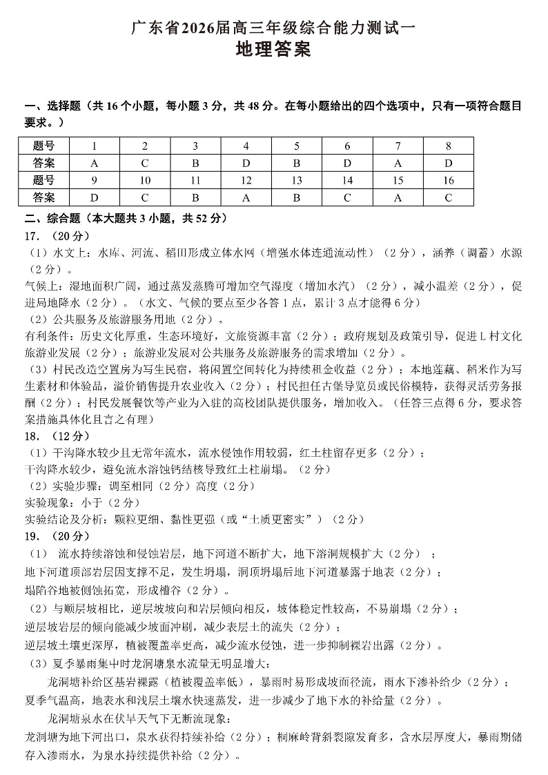 高三地理答案--广东省光大联考2026届高三上学期综合能力测试(一)