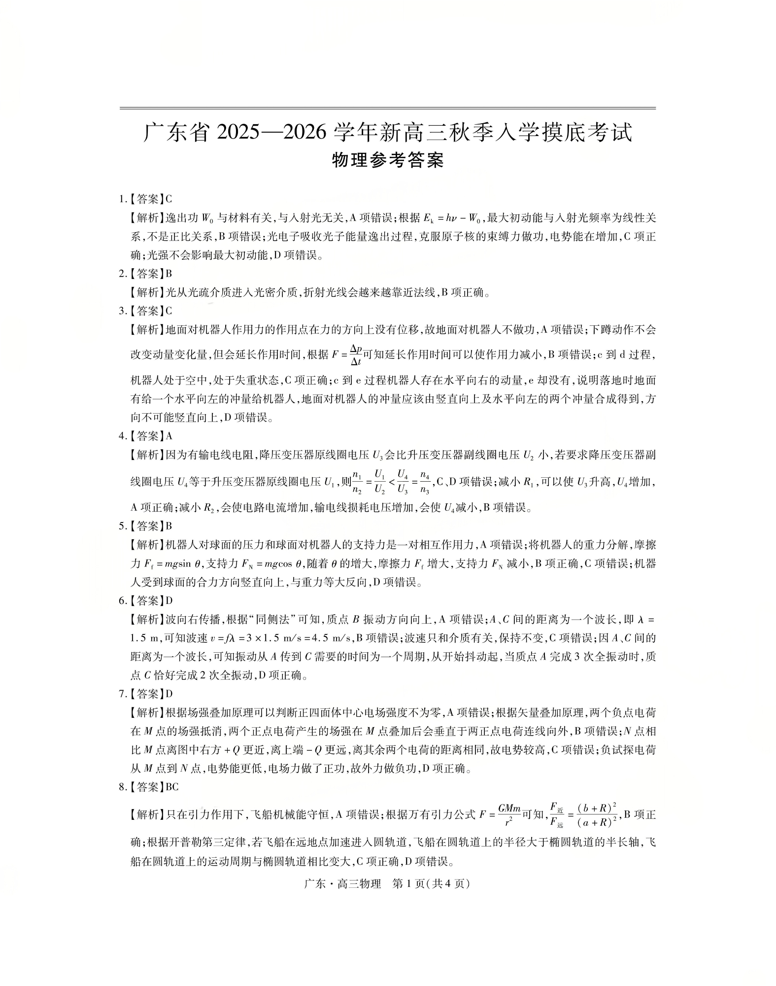 高三物理答案--广东省上进联考2026届新高三8月秋季入学摸底考试