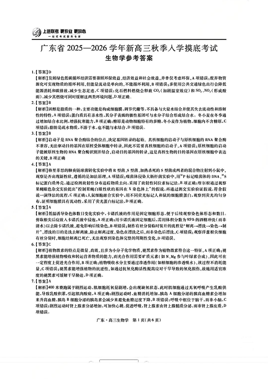 高三生物答案--广东省上进联考2026届新高三8月秋季入学摸底考试