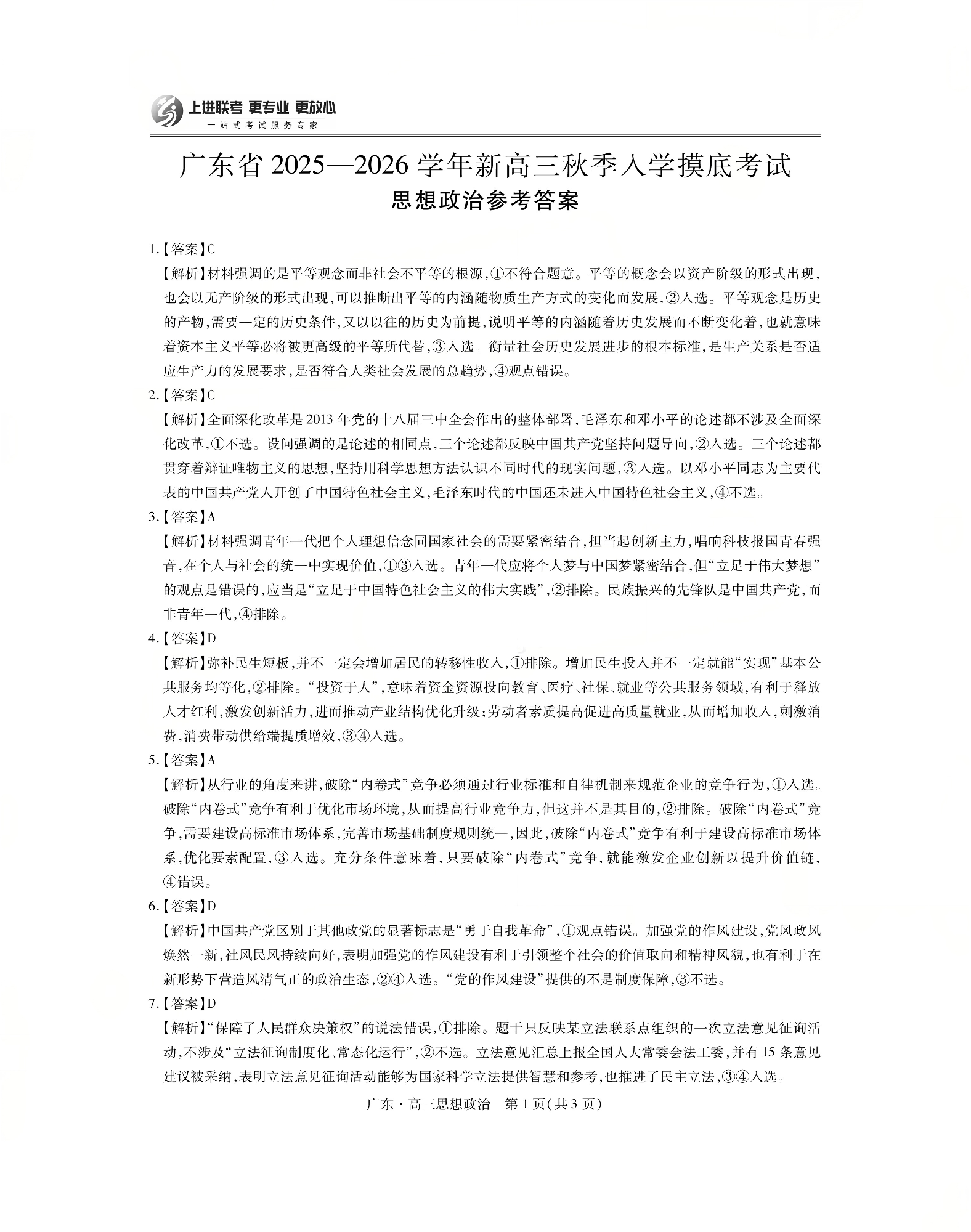 上进联考2025-2026学年新高三秋季入学摸底考试政治答案