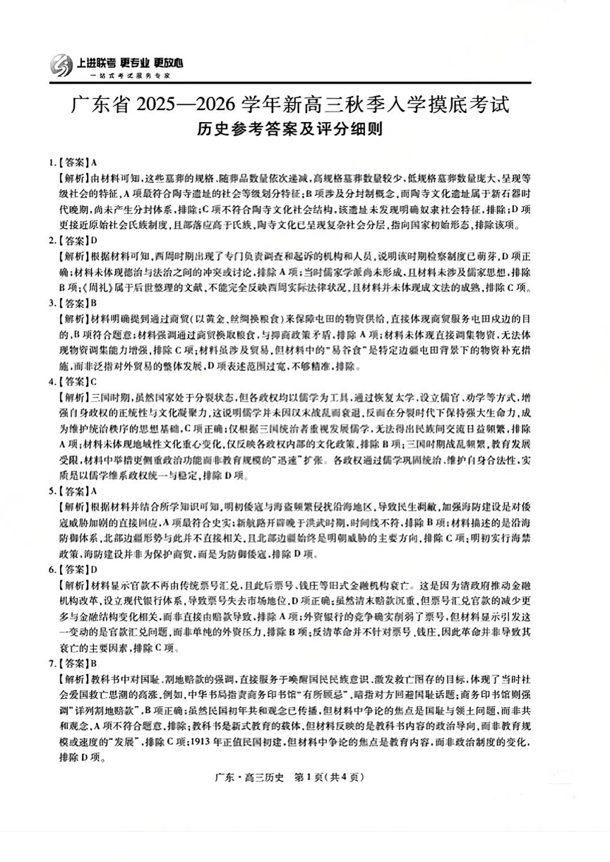 高三历史答案--广东省上进联考2026届新高三8月秋季入学摸底考试