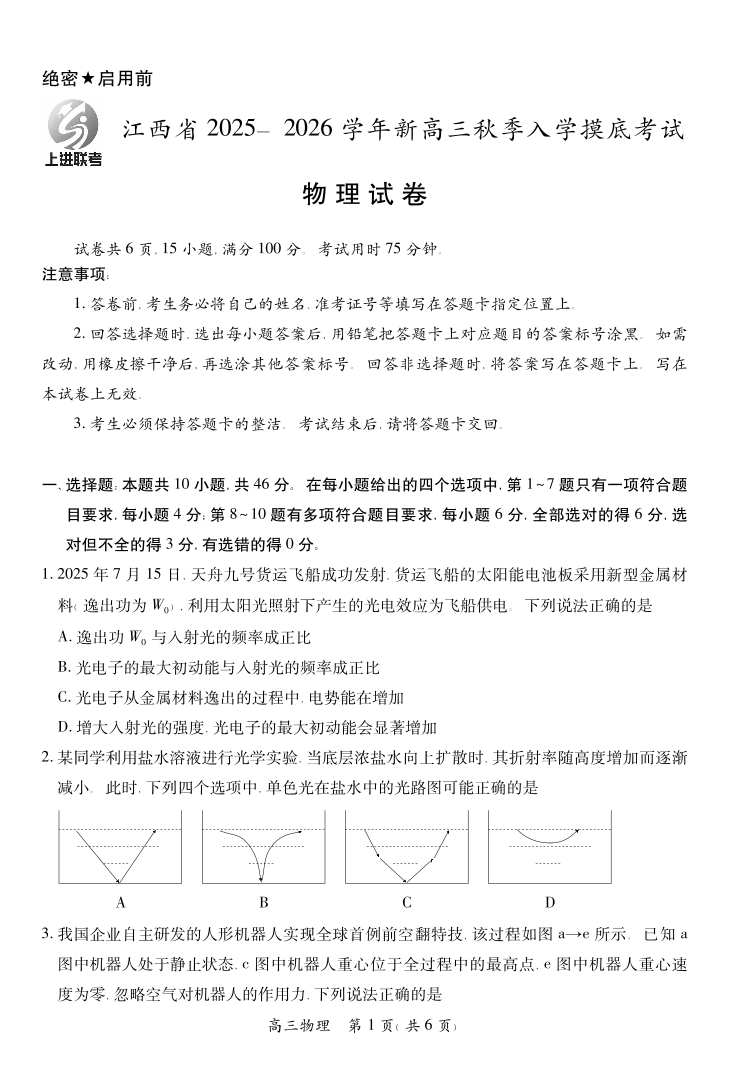 高三物理--江西省上进联考2026届新高三8月秋季入学摸底考试