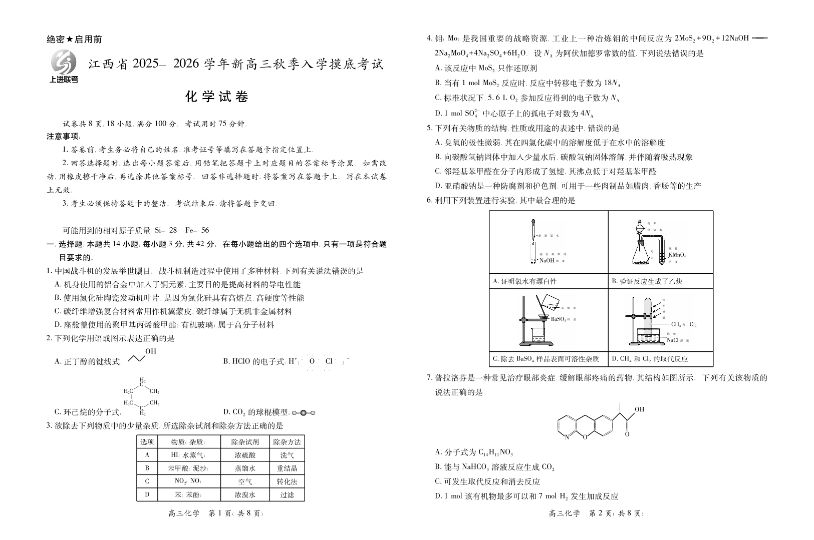 高三化学--江西省上进联考2026届新高三8月秋季入学摸底考试