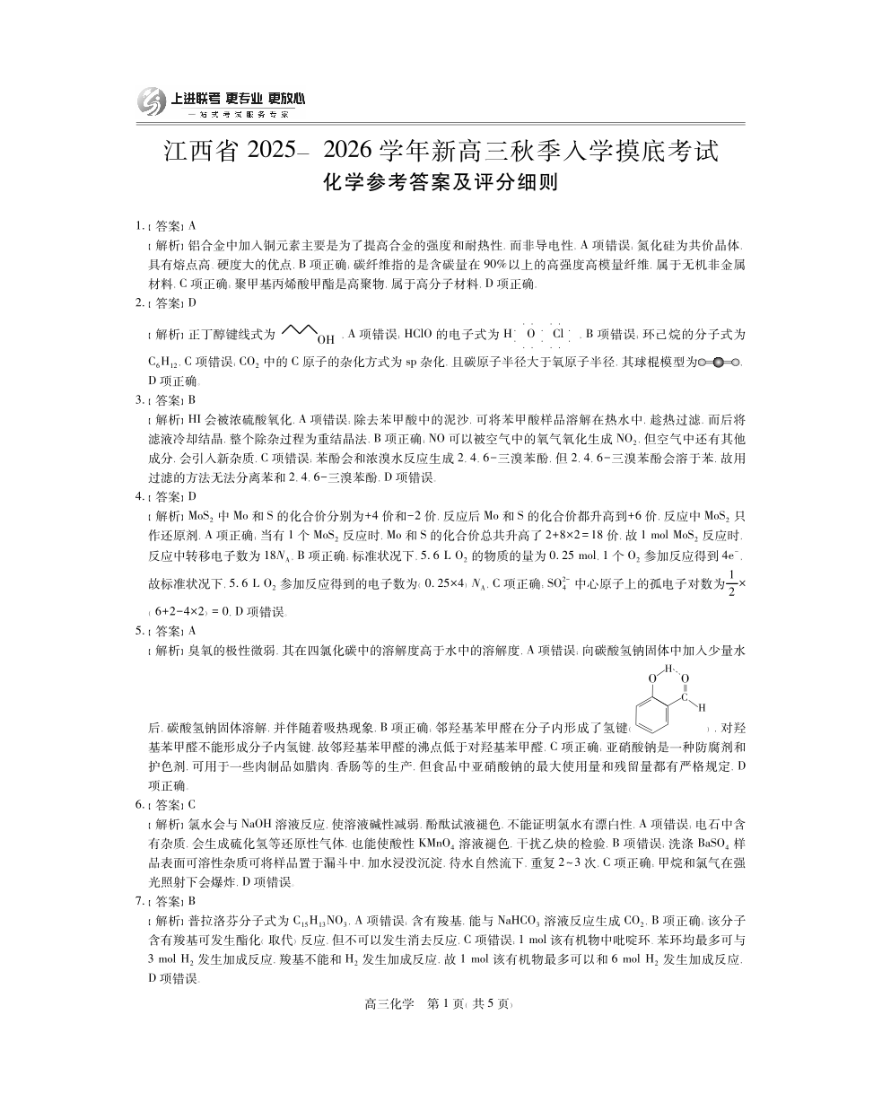 高三化学答案--江西省上进联考2026届新高三8月秋季入学摸底考试