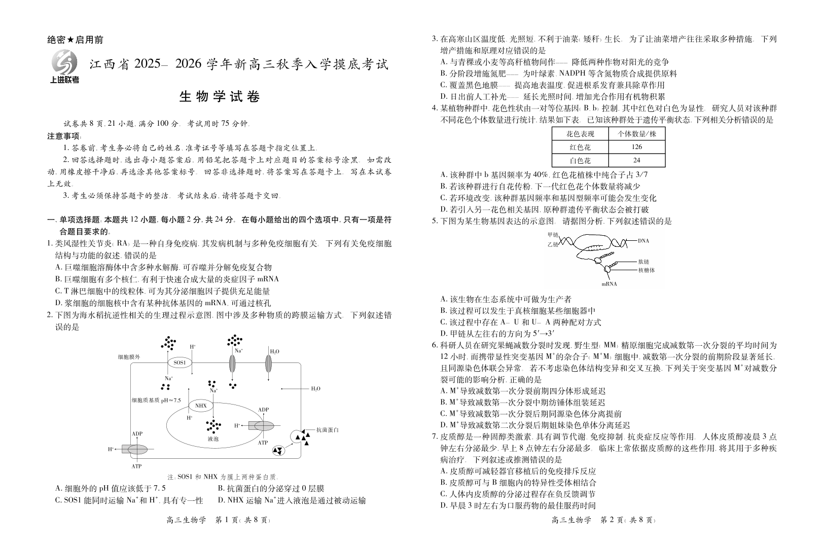 高三生物--江西省上进联考2026届新高三8月秋季入学摸底考试