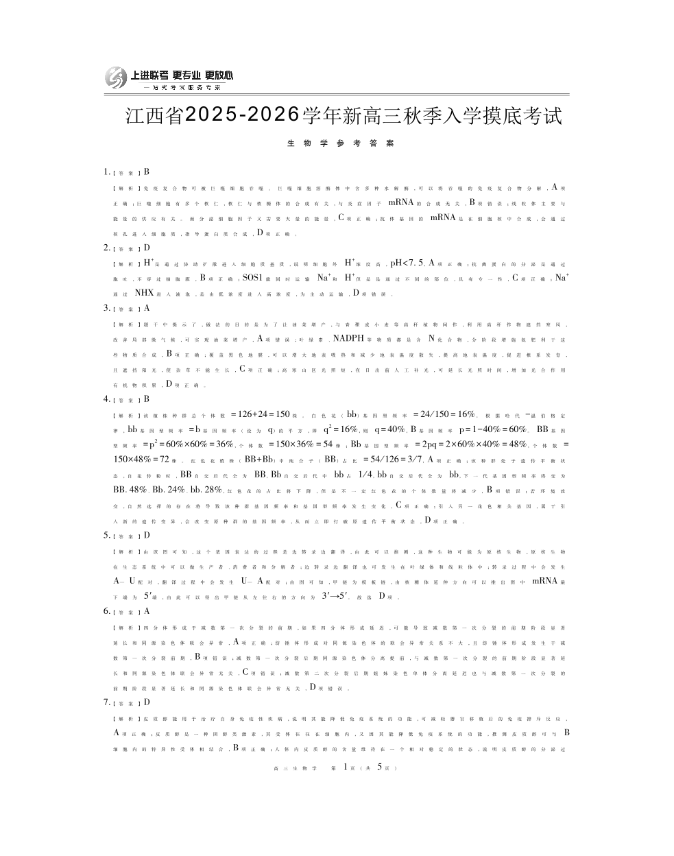 高三生物答案--江西省上进联考2026届新高三8月秋季入学摸底考试