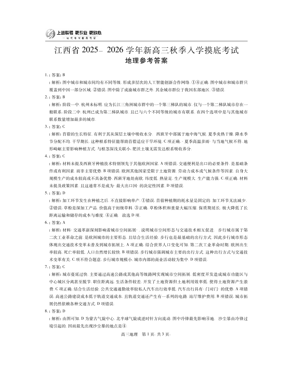 高三地理答案--江西省上进联考2026届新高三8月秋季入学摸底考试