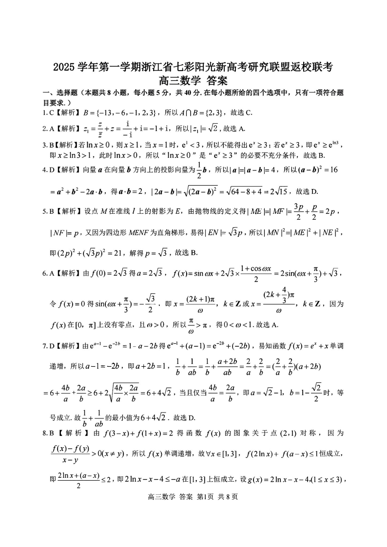 高三数学答案--浙江省七彩阳光新高考研究联盟2026届高三上学期8月返校联考