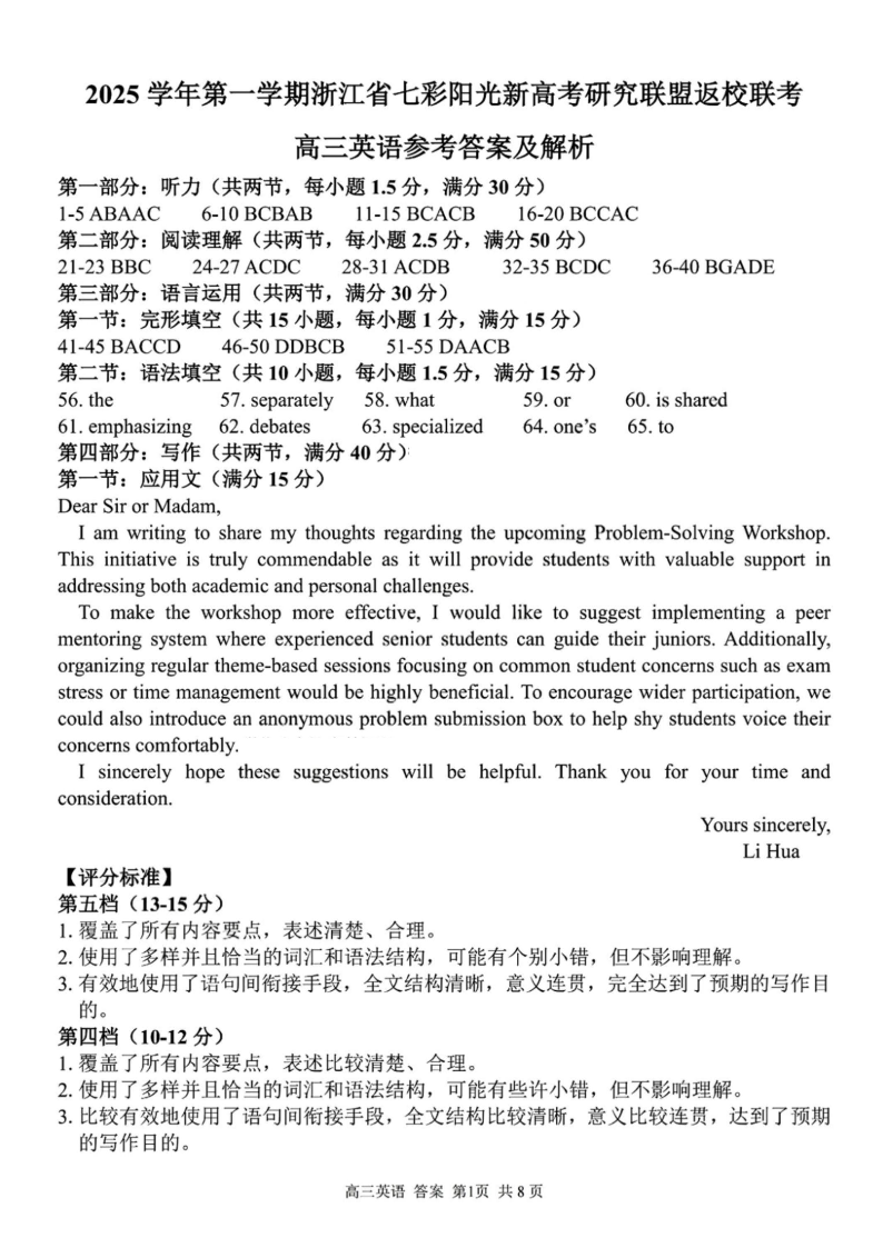 高三英语答案--浙江省七彩阳光新高考研究联盟2026届高三上学期8月返校联考