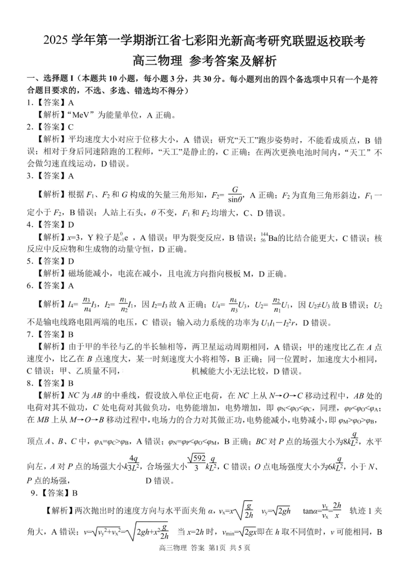 高三物理答案--浙江省七彩阳光新高考研究联盟2026届高三上学期8月返校联考