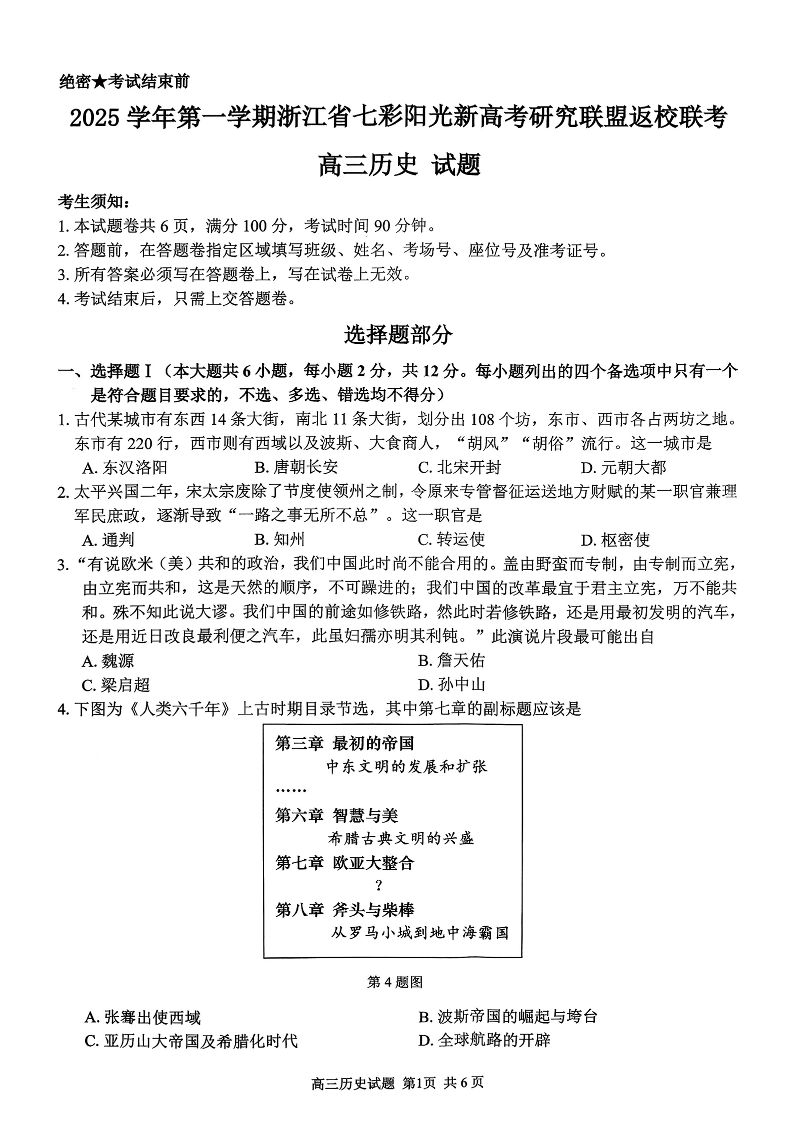 高三历史--浙江省七彩阳光新高考研究联盟2026届高三上学期8月返校联考
