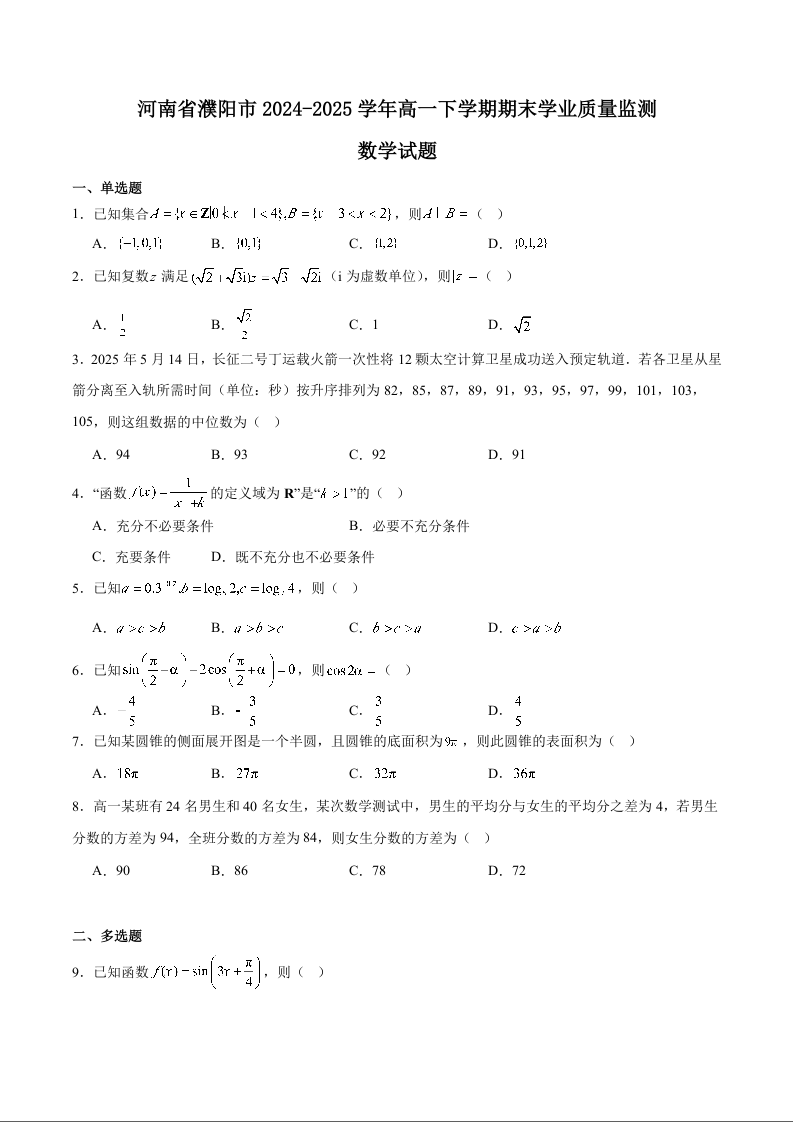高三数学+答案--河南省濮阳市2024-2025学年高一下学期7月期末考试