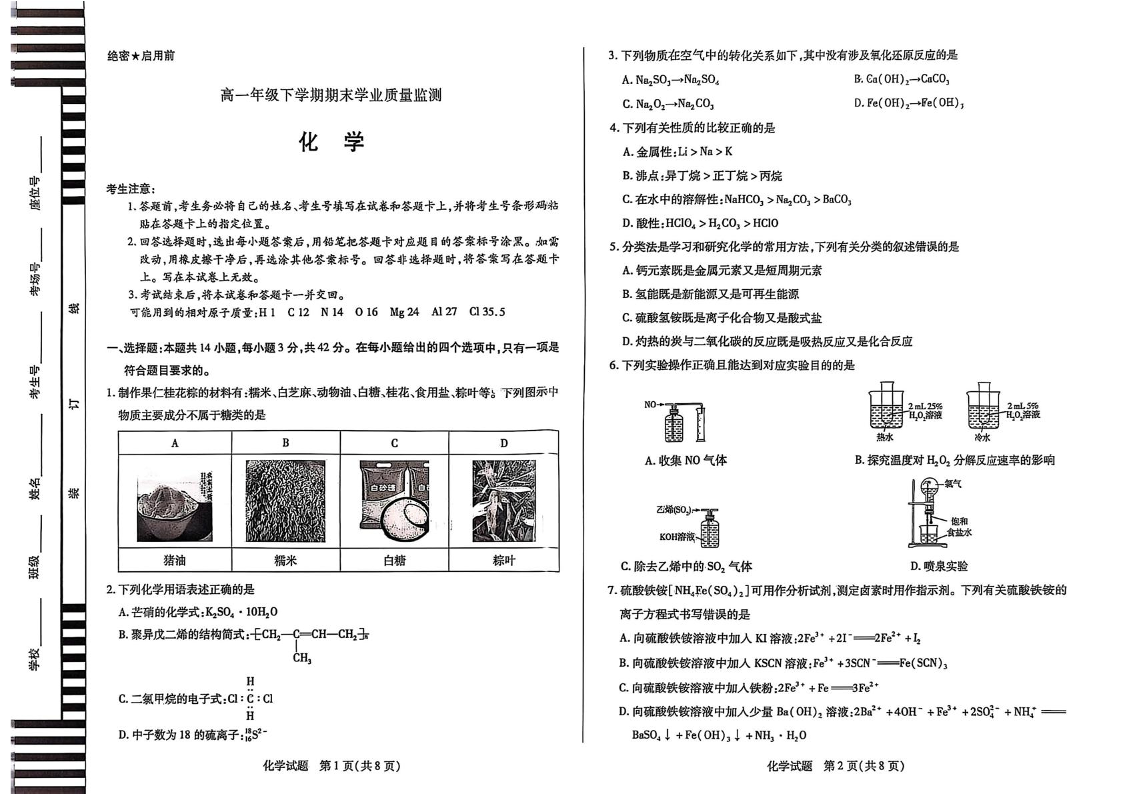 高三化学+答案--河南省濮阳市2024-2025学年高一下学期7月期末考试
