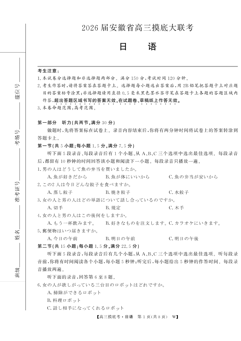 高三日语--安徽省皖南八校2026届高三上学期8月摸底大联考