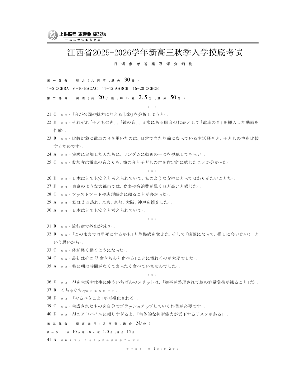 高三日语答案--江西省上进联考2026届新高三8月秋季入学摸底考试