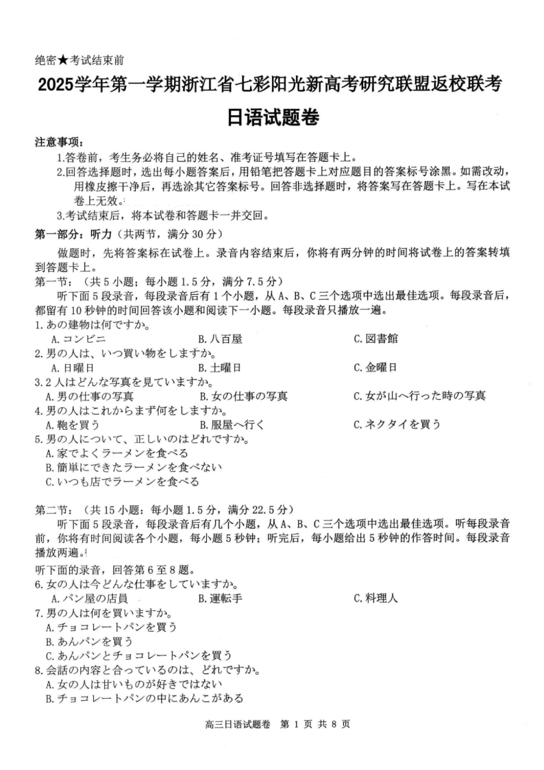 高三日语--浙江省七彩阳光新高考研究联盟2026届高三上学期8月返校联考