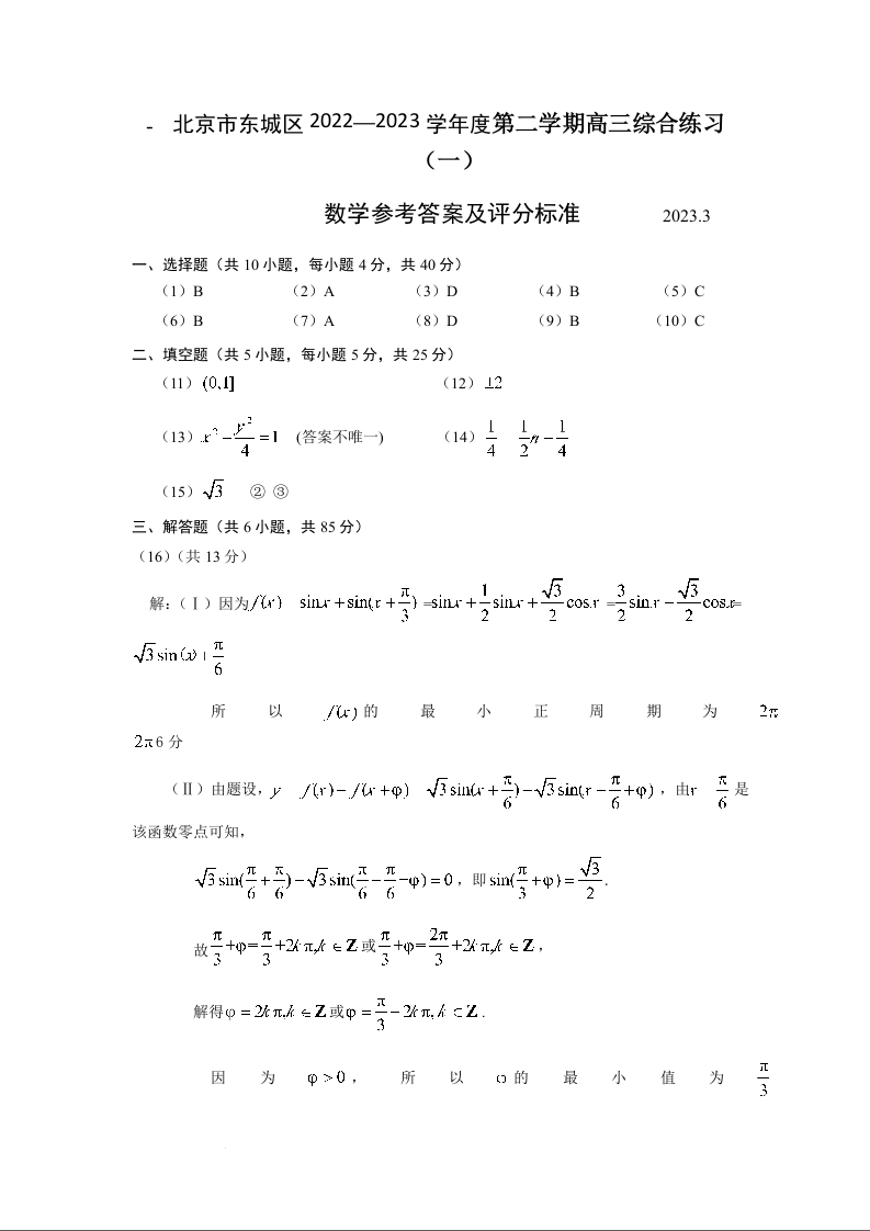 高三数学答案--北京市东城区2023高三一模