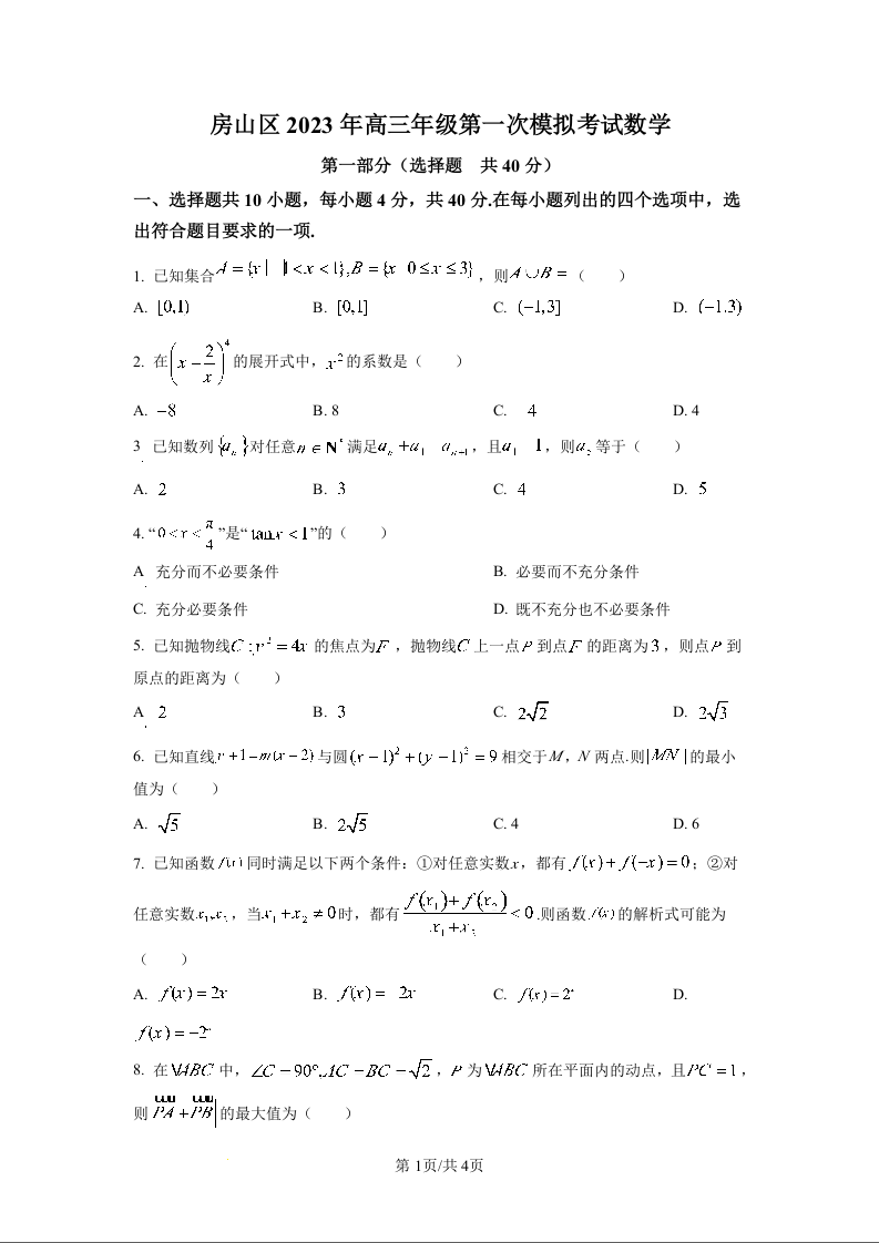 高三数学(原卷版)--北京市房山区2023高三一模