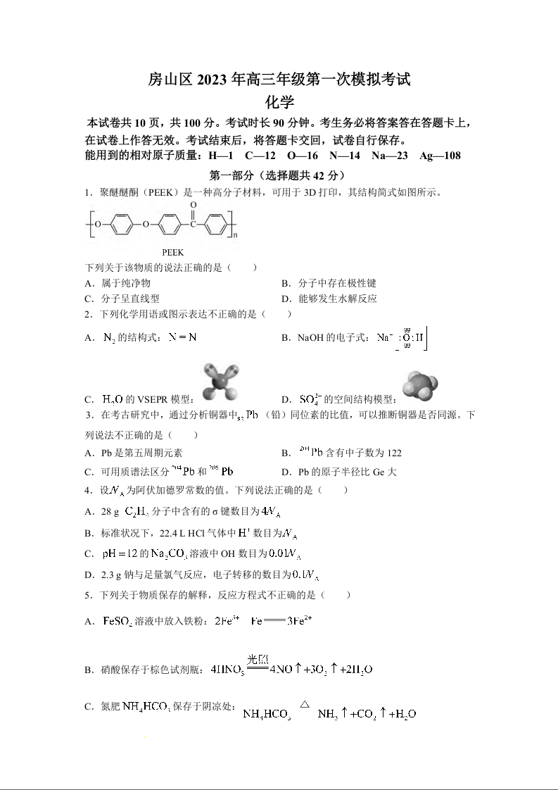 高三化学--北京市房山区2023高三一模