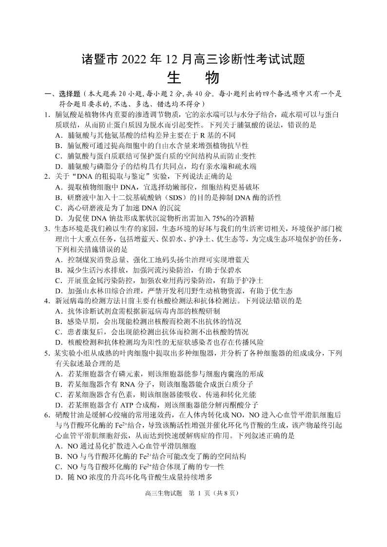 高三生物--浙江省诸暨市2022-2023学年高三上学期12月诊断性性考试